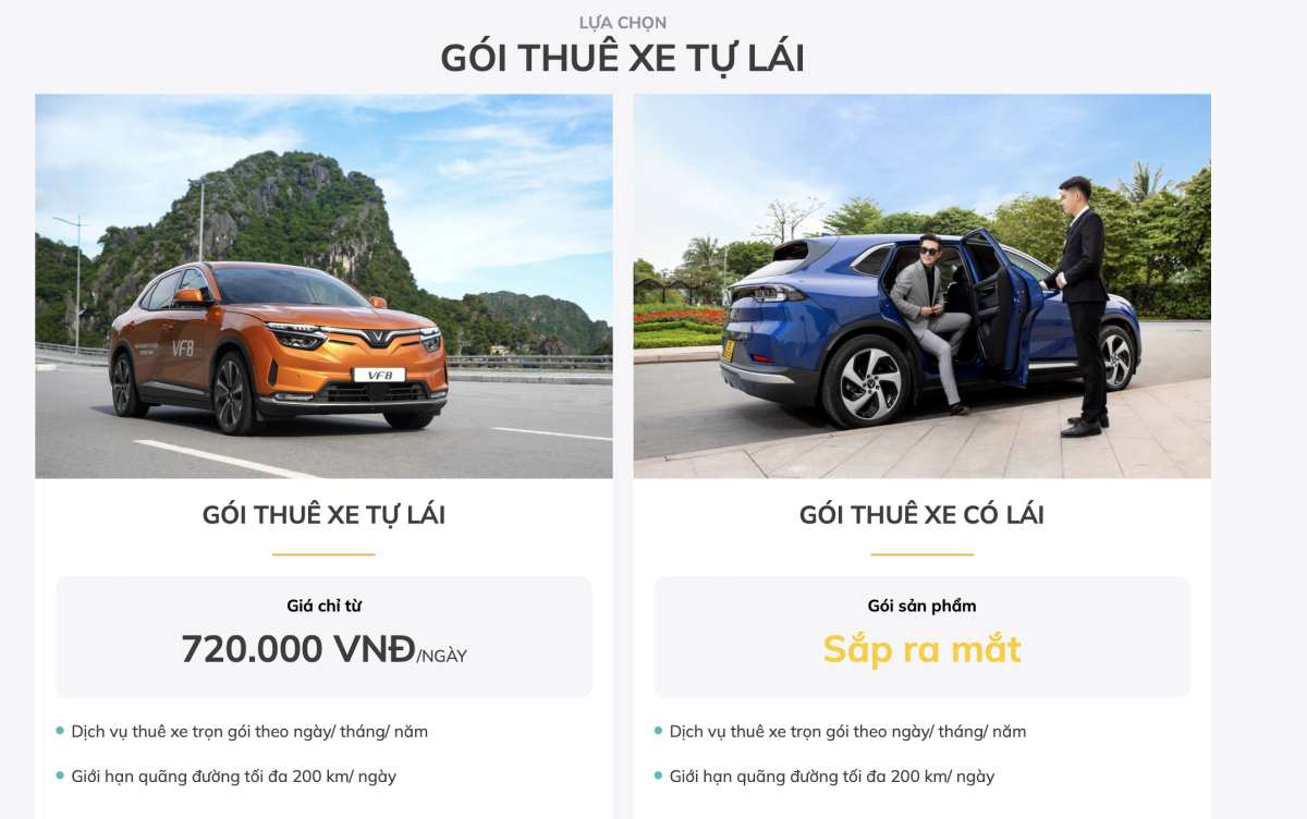 Ngoài gói thuê tết nguyên đán, VinFast còn cung cấp nhiều gói thuê xe khác phục vụ nhu cầu đi lại của khách hàng quanh năm như gói thuê ngày, thuê tuần, thuê tháng... với những chương trình khuyến mại liên tục. Đặc biệt, khách hàng có thể thuê xe trực tuyến qua website xanhsm.com hoặc đến trực tiếp các showroom của VinFast trên toàn quốc.
