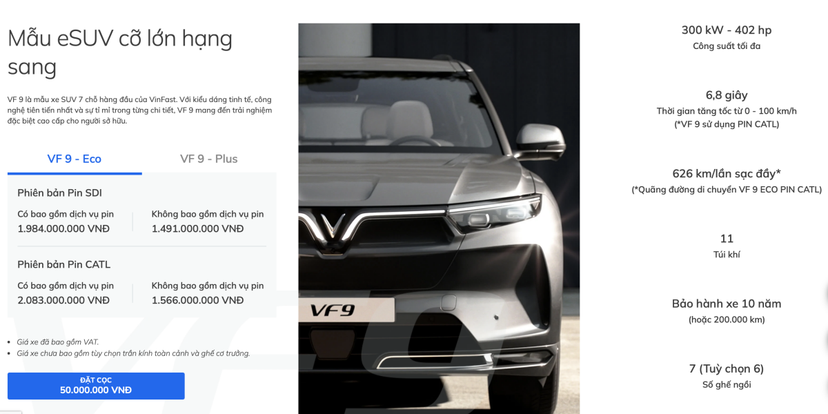 VF 9 có 2 phiên bản ECO và PLUS với giá bán lần lượt từ 1,491 tỷ và 1,685 tỷ đồng. Cả hai phiên bản đều trang bị nội thất rộng rãi 7-6 chỗ ngồi, màn hình cảm ứng trung tâm và nhiều tính năng an toàn tiên tiến.