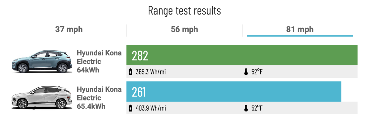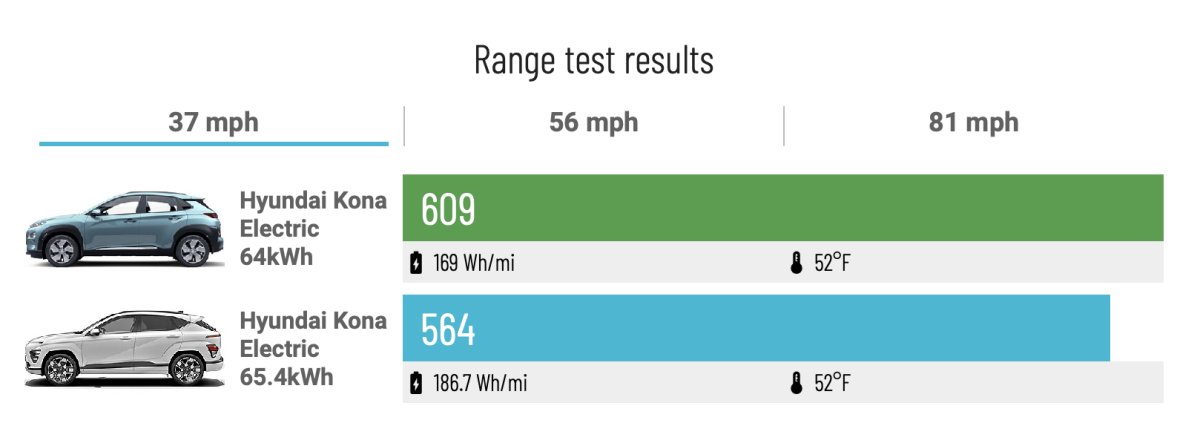Tuy nhiên, Kona mới cũng nặng hơn 243 pound và trang bị lốp 19 inch (17 inch cũng có). Lốp trên phiên bản thử nghiệm là Yokohama BluEarth Winter V905 trong khi Kona cũ dùng lốp 17 inch Michelin CrossClimate 2 - hiệu quả hơn nhiều. Cả hai xe được kiểm tra ở nhiệt độ 52°F và cách nhau đủ xa để không ảnh hưởng tới khí động học.