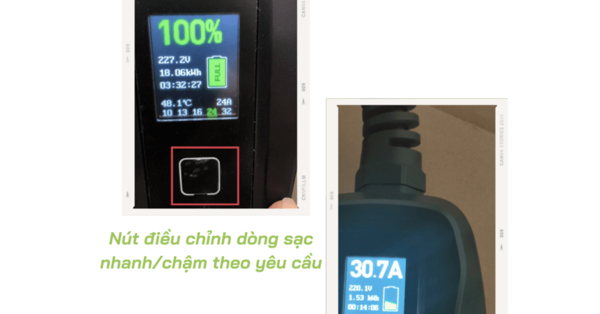 Bộ sạc được trang bị hệ thống kiểm soát nhiệt độ thông minh, có thể ngắt dòng khi nhiệt độ quá cao để đảm bảo an toàn. Người dùng có thể điều chỉnh dòng điện khác nhau để sạc theo yêu cầu.