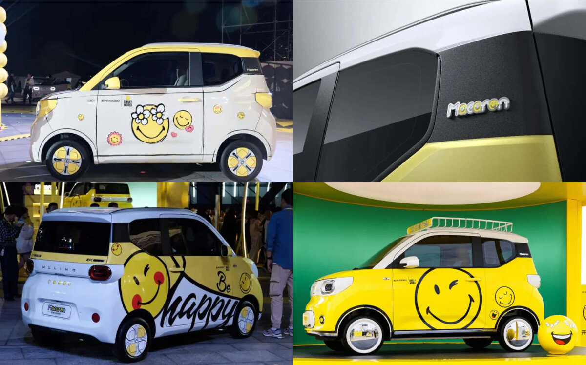 So với thế hệ trước, có thể thấy Wuling Hongguang MiniEV thế hệ thứ 3 có thiết kế tròn trịa hơn, kết hợp với bộ mâm cỏ 4 lá 12 inch, giá để hành lý trên nóc xe và logo độc quyền của thương hiệu SmileyWorld.
