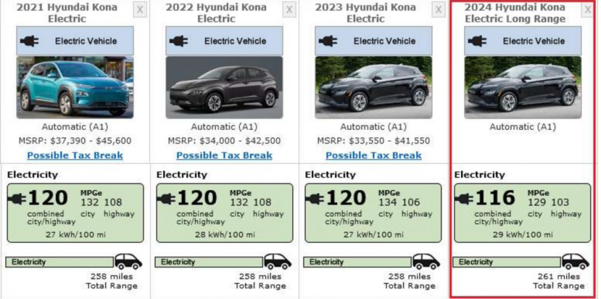 Cơ quan bảo vệ môi sinh Mỹ (EPA) vừa công bố chính xác về quãng đường có thể đi được của chiếc xe Hyundai Kona Electric 2024. Xe đạt quãng đường 419,3 km thử nghiệm ở Mỹ với pin 64,8 kWh. Đây là khoảng cách đi được cao hơn 4,8km so với Hyundai Kona Electric 2023 với pin 64 kWh nhỏ hơn chút.