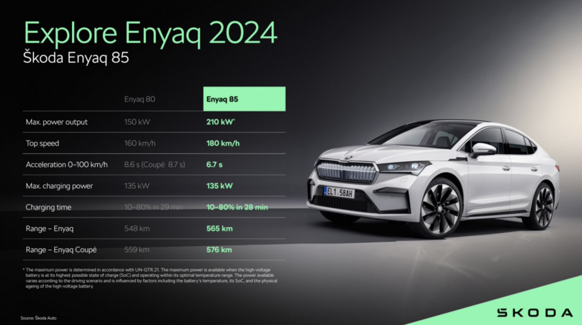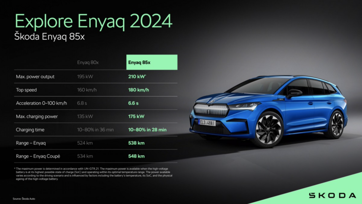 Skoda công bố nâng cấp đáng kể cho mẫu SUV Enyaq cho năm 2024, mang lại phạm vi hoạt động xa hơn, sạc nhanh hơn và mô-men xoắn lớn hơn. Điều này là nhờ vào động cơ điện sau mới và công nghệ pin mới. Danh mục sản phẩm Enyaq giảm xuống còn 3 mẫu là 85, 85x và RS (các phiên bản khác Coupe cũng sẽ được nâng cấp) - tất cả đều trang bị hệ dẫn động mới.