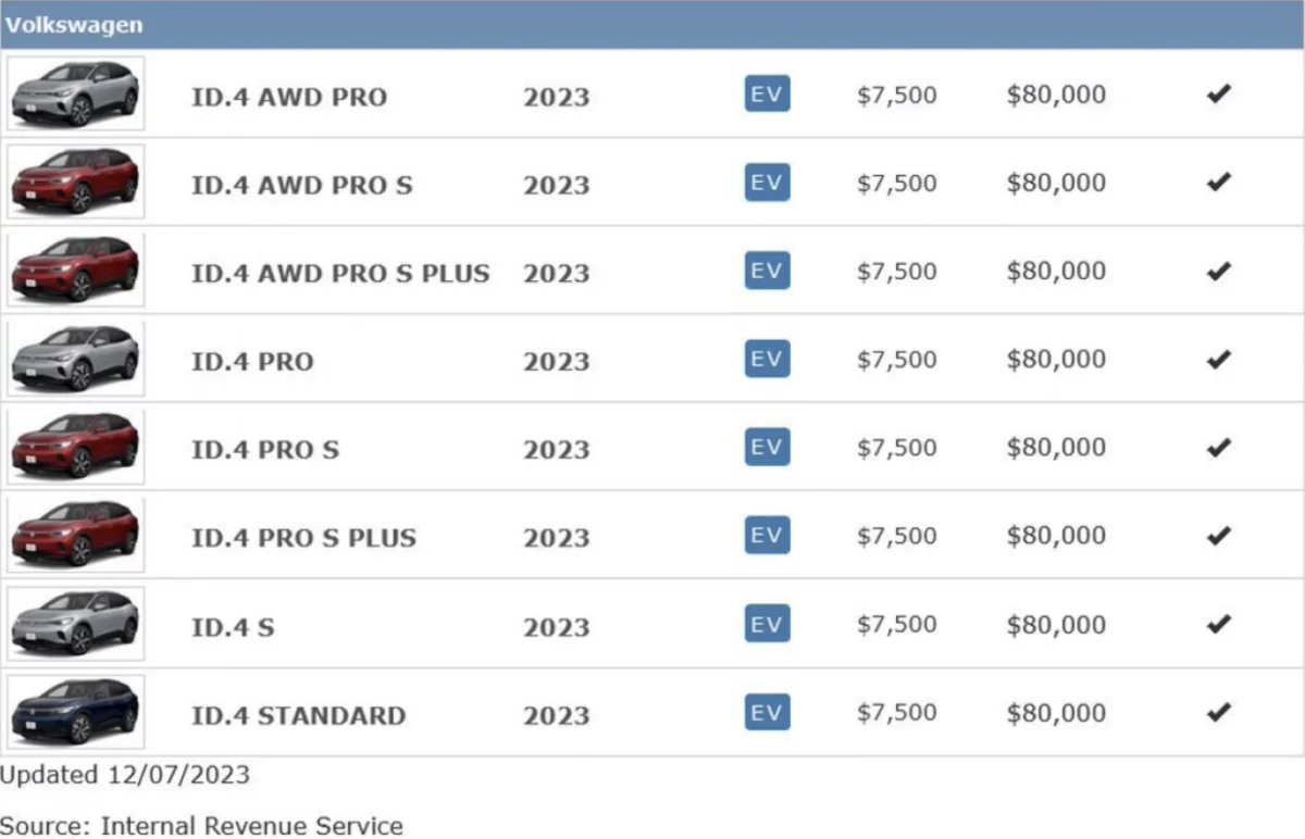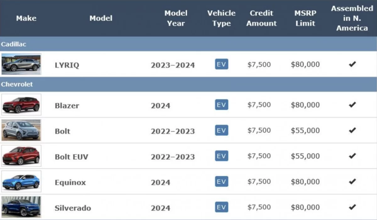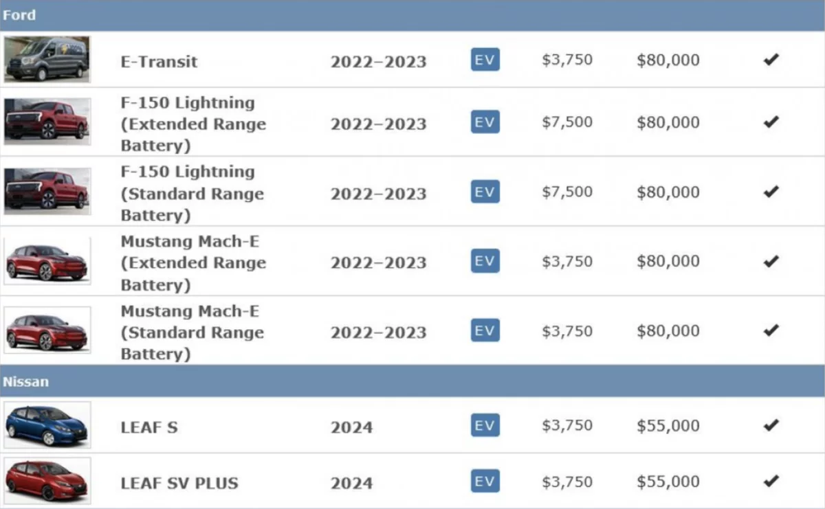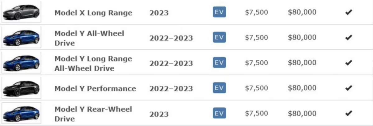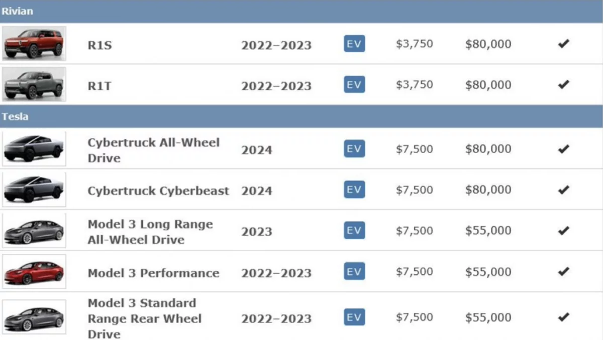 Trước khi hy vọng vào ưu đãi thuế này, cần lưu ý thông tin có thể thay đổi bởi tín dụng EV sẽ có những quy định mới về nguồn nguyên liệu pin từ Trung Quốc từ tháng 1/2023. Dưới đây là danh sách các xe EV đủ điều kiện nhận khoản tín dụng giảm giá: