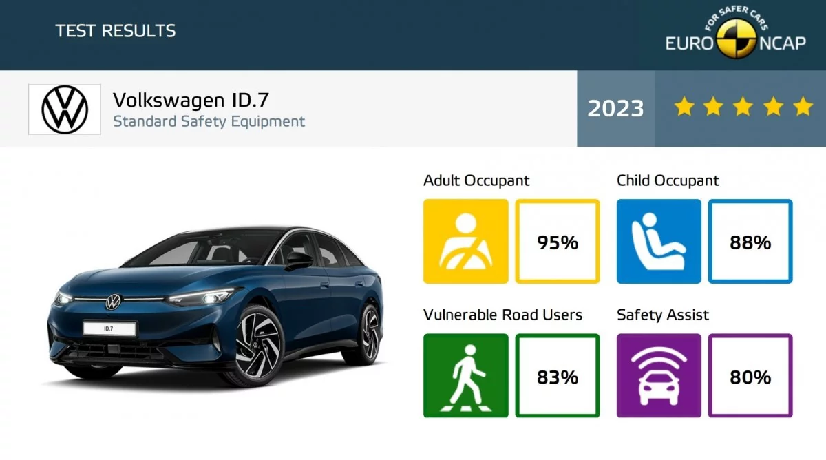 Euro NCAP đánh giá các phương tiện dựa trên hiệu suất của từng mẫu xe trong bốn hạng mục an toàn quan trọng và ID.7 đạt điểm đánh giá xuất sắc là 95%. Điều đáng chú ý là ID.7 đã xuất sắc ở hạng mục “Bảo vệ hành khách là người lớn”.