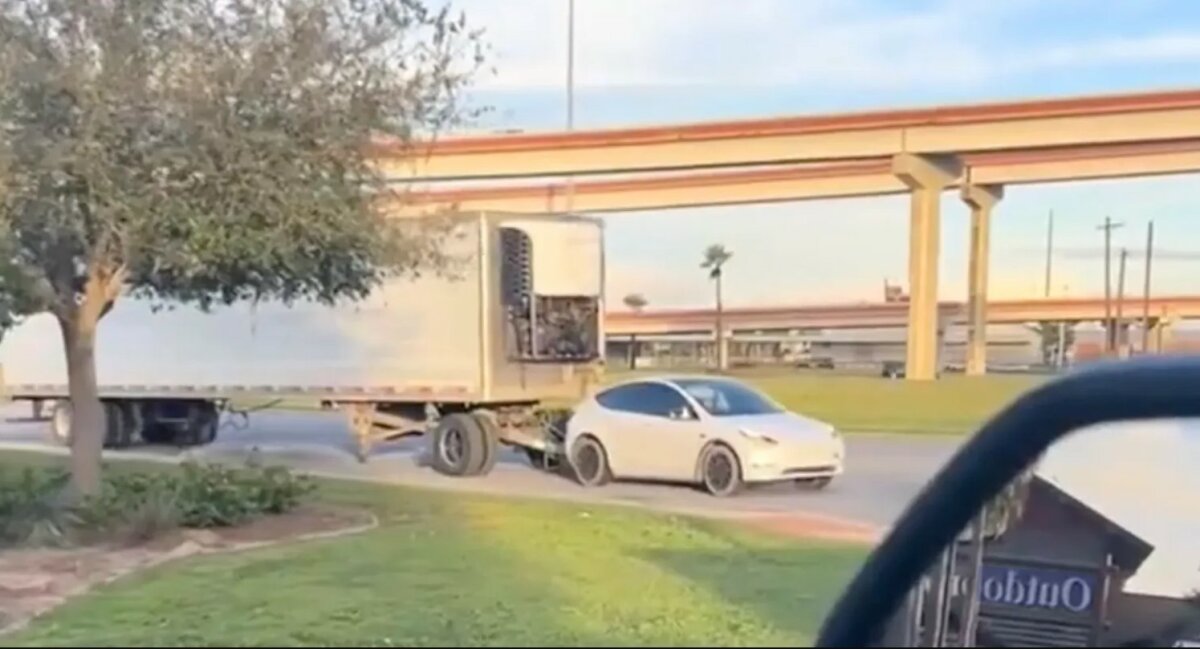 Người dùng mạng xã hội hôm nay lan truyền một video ngắn cho thấy chiếc xe điện Tesla Model Y đang kéo theo một chiếc rơ moóc đầu kéo cỡ lớn ở phía sau và lăn bánh trên đường phố.