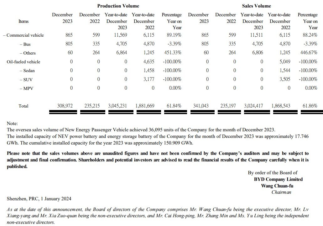 Trong báo cáo doanh số năm 2023, hãng xe điện đến từ Trung Quốc BYD cho biết họ đã bán được 3.024.417 chiếc xe sử dụng năng lượng mới. Mức tăng này vượt xa đáng kể kỷ lúc bán hàng của năm trước là 1.863.494 xe, phản ánh mức tăng 62,3%.