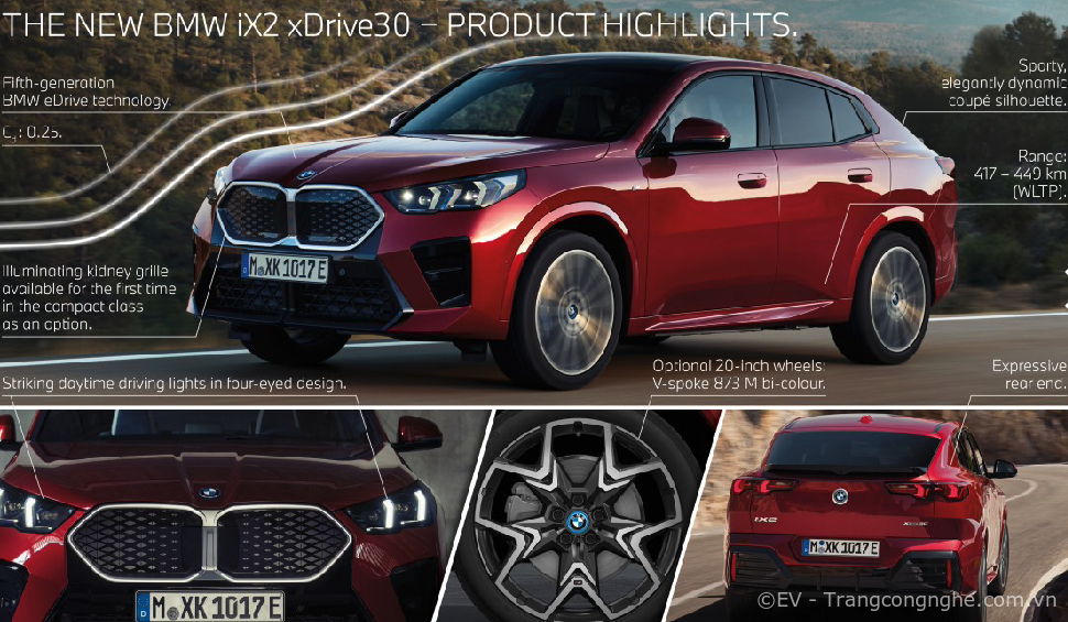 BMW vừa giới thiệu dòng xe mới BMW X2 hoàn toàn mới, bao gồm lần đầu tiên là mẫu xe điện (EV), BMW iX2. Chỉ có duy nhất một phiên bản BMW iX2 xDrive30, thiết kế của iX2 gây tranh cãi dưới cộng đồng người yêu xe điện BMW với thiết kế không liền mạch.