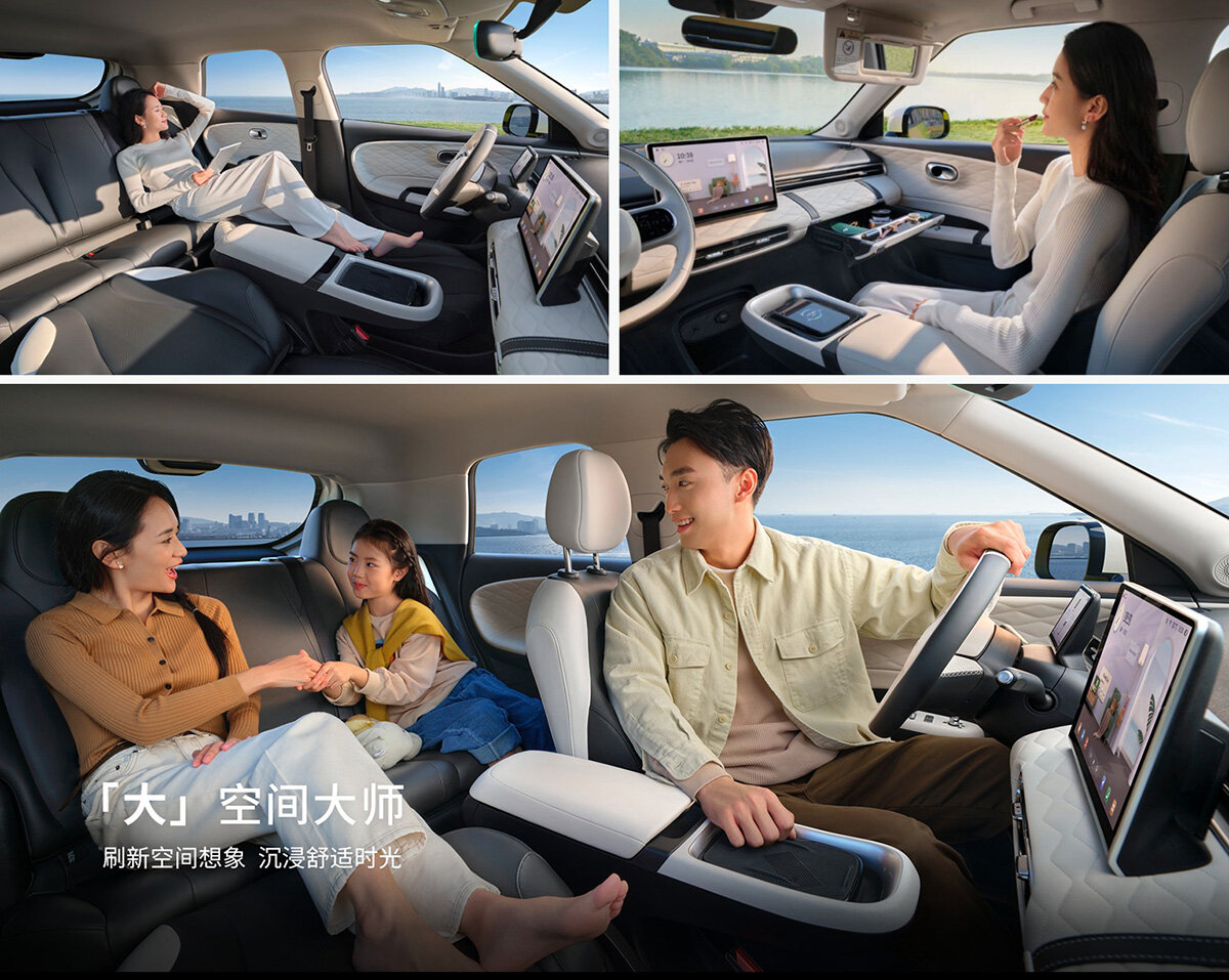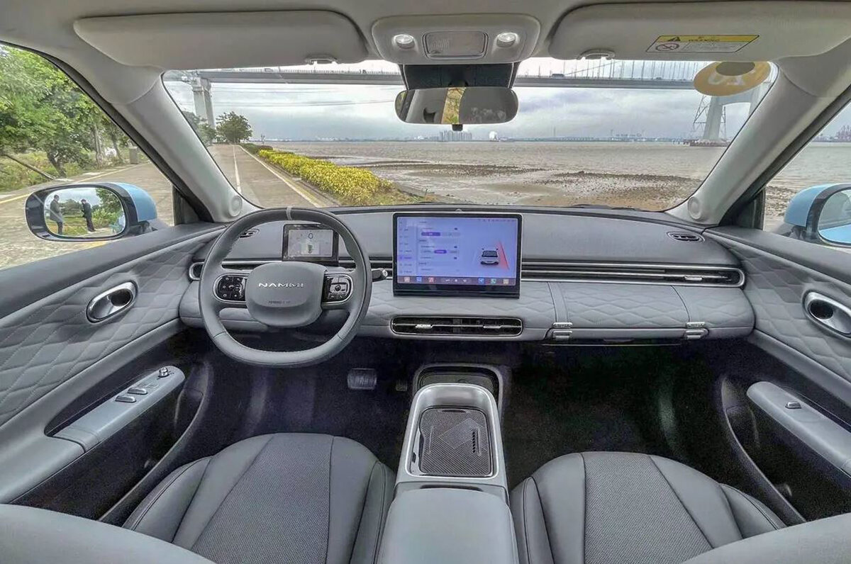 Bước vào trong cabin, khoang nội thất có vẻ khá đơn giản, tương tự như những mẫu ô tô điện gần đây của Trung Quốc, với hai tone màu là Đen trắng và Đen xám. Khoang lái được trang bị đồng hồ LCD 5 inch, vô lăng hai chấu đa chức năng, màn hình giải trí trung tâm kích thước 12,8 inch hỗ trợ các tính năng kết nối điện thoại, cập nhật OTA và điều khiển bằng giọng nói thông minh.