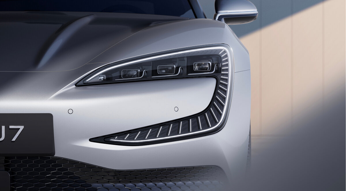 U7 có đường nắp ca-pô dốc và cảm biến LiDAR của RoboSense đặt ở phía trên kính lái tương tự Xiaomi SU7. Phần đầu xe sử dụng đèn pha đặc trưng của thương hiệu. Cản trước có khe hút gió lớn tích hợp radar siêu âm. Cánh gió bên được làm bằng sợi carbon.
