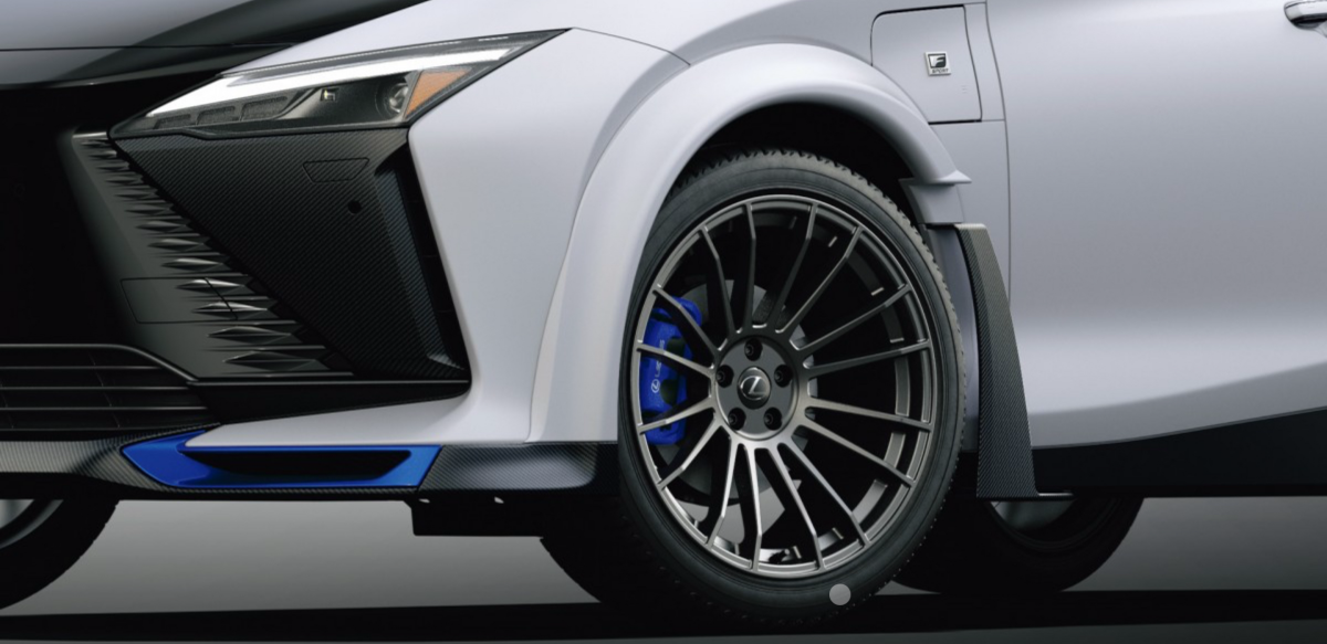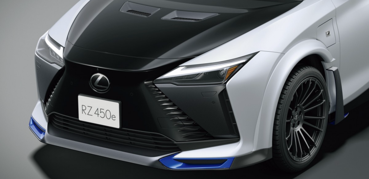 RZ450e F Sport Performance mang thiết kế ngoại thất ấn tượng với nhiều chi tiết carbon và màu sắc tương phản bắt mắt. Lưới tản nhiệt, panel dưới đèn pha, nắp capô đều được làm bằng sợi carbon. Thân xe có các chi tiết rộng hơn như ốp gương và hốc bánh được trang trí carbon. Bánh xe kích thước lớn 21 inch được sơn màu đen bóng tông xuyệt tôn thêm vẻ khỏe khoắn.