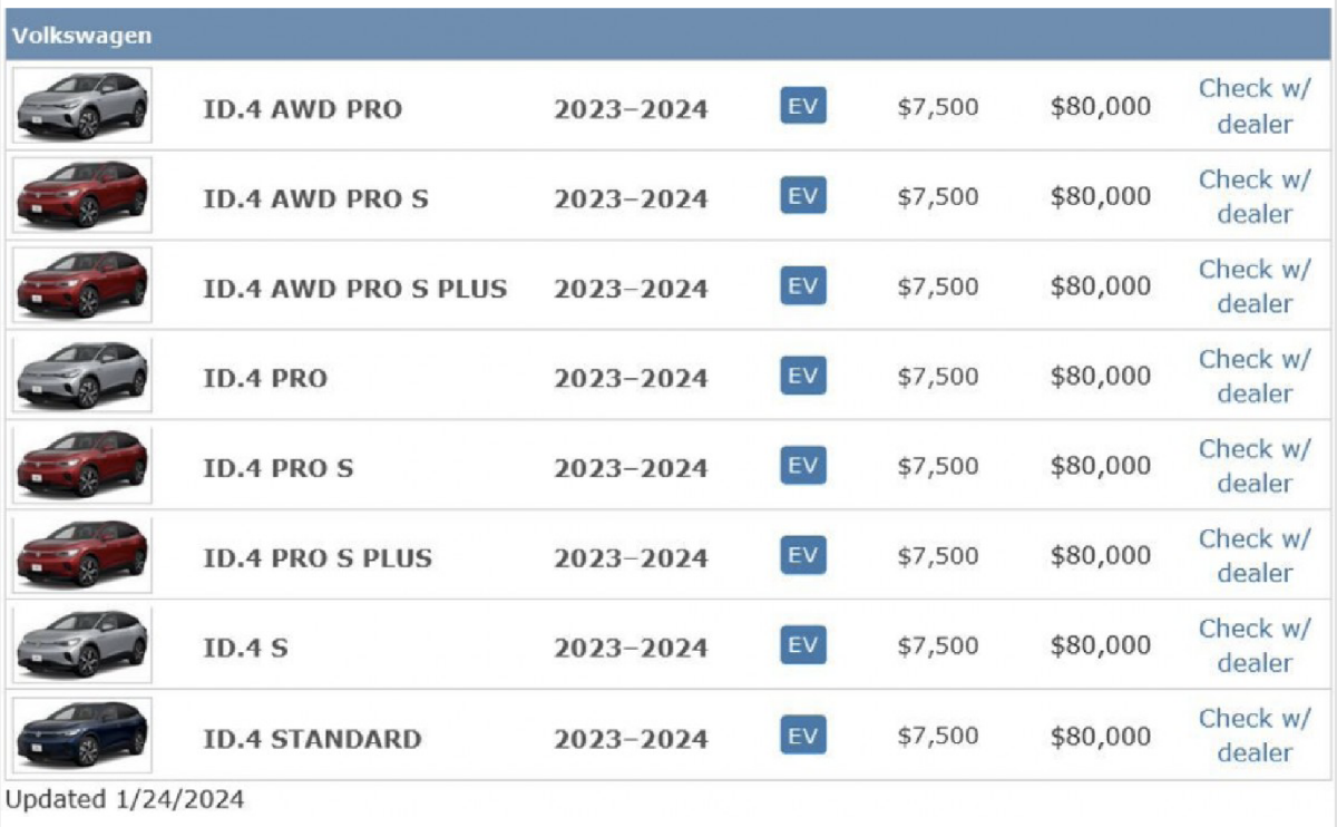 Volkswagen đã xác nhận rằng mẫu xe điện (EV) ID.4 của họ sẽ đủ điều kiện nhận toàn bộ khoản tín dụng thuế liên bang trị giá 7.500 USD tại thị trường Hoa Kỳ bắt đầu từ năm 2024. Trước đó, các mẫu ID.4 sản xuất năm 2023 vẫn đủ tiêu chuẩn nhưng không nằm trong danh sách ban đầu công bố vào đầu năm nay.