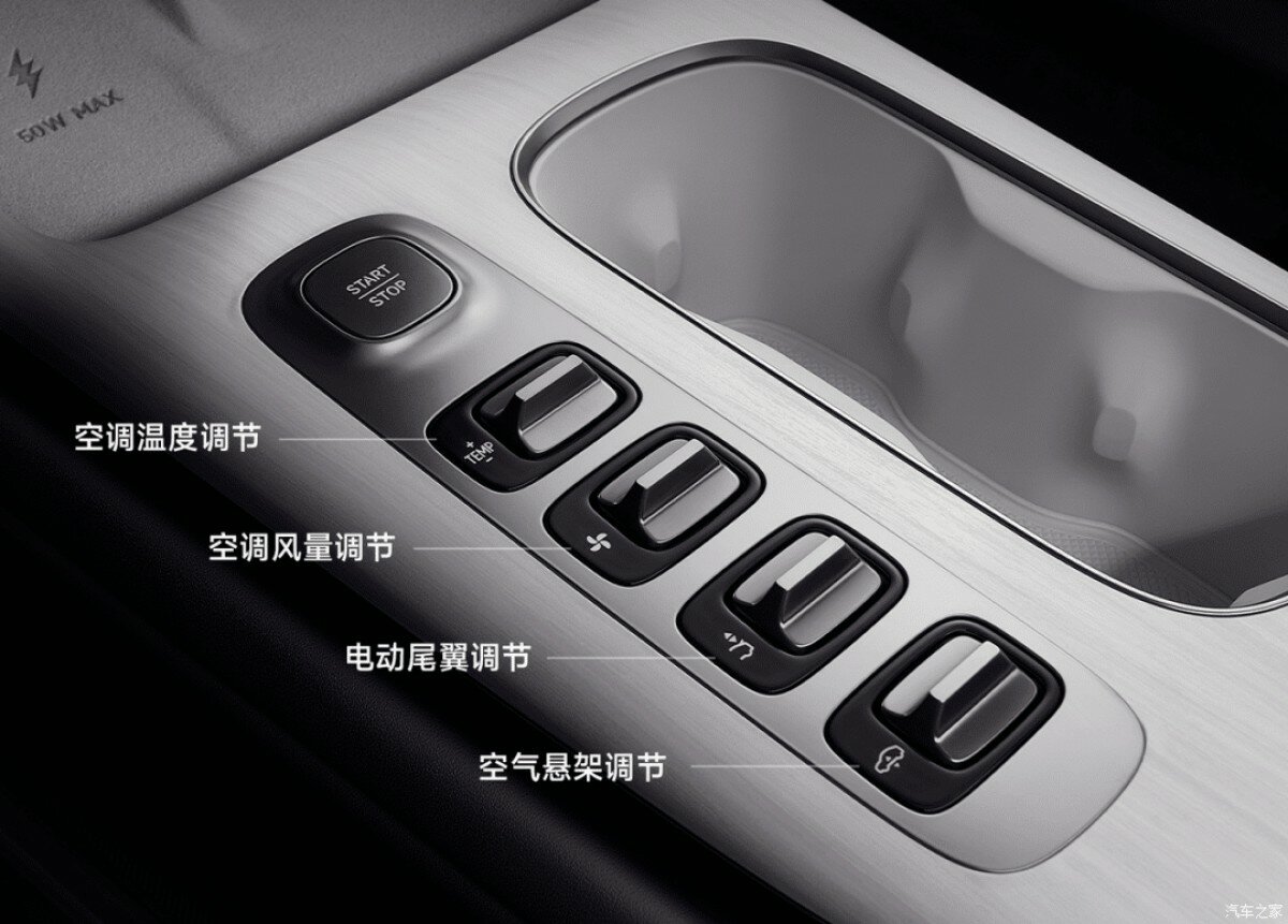 Bệ tì tay bên phải trang bị dãy phím bấm vật lý khá nhỏ gọn với các chức năng chính như điều chỉnh điều hòa, tăng giảm độ cao xe và điều chỉnh cánh gió sau, nút Start/Stop nằm ở trên cùng.