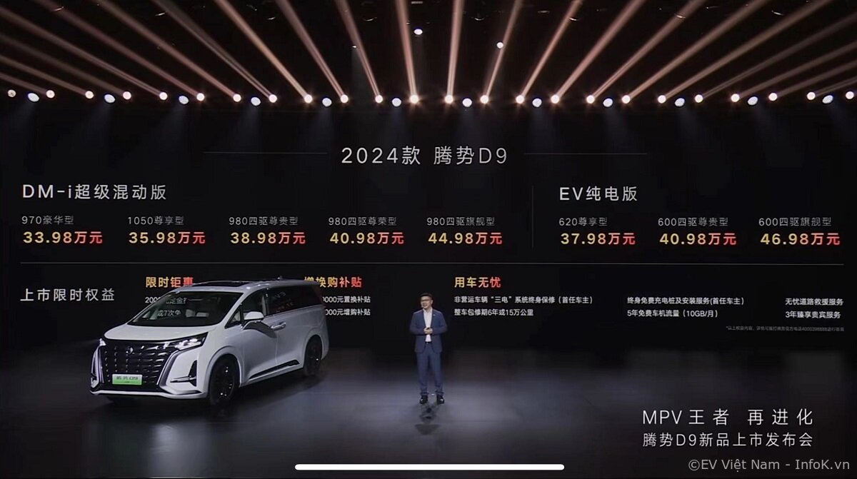 BYD Denza D9, mẫu MPV bán chạy nhất Trung Quốc mới đây đã ra mắt phiên bản mới, với hai lựa chọn phiên bản BEV và PHEV cùng giá bán khởi điểm từ 1,16 tỷ đồng.