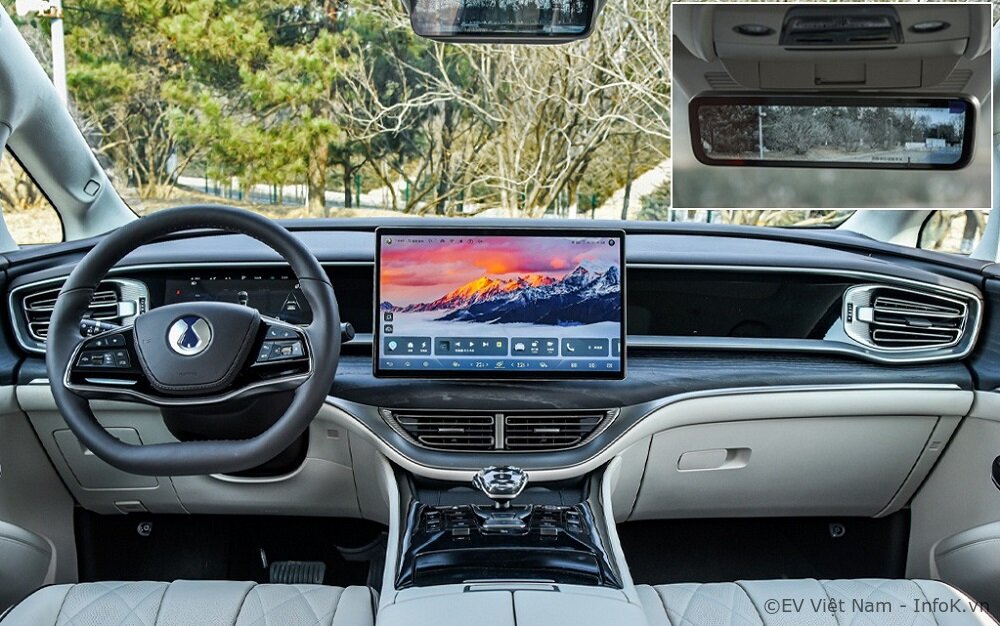 Denza D9 2024 có hai cấu hình là 7 chỗ và 4 chỗ . Cụm đồng hồ LCD 10,25 inch sau vô lăng cùng màn hình giải trí trung tâm kích thước 15,6 inch. Bên cạnh đó, mẫu xe còn có màn hình hiển thị trên kính lái khá tiện dụng.
