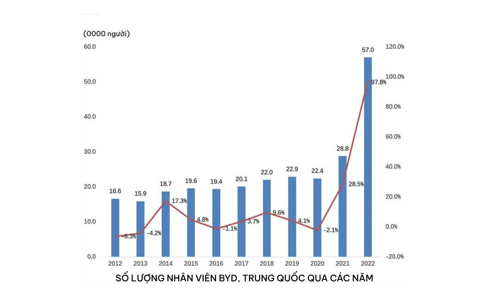 BYD, nhà sản xuất xe điện lớn nhất Trung Quốc, đã tăng cường mở rộng quy mô sản xuất và gia tăng nhân sự . Hiện nay, số lượng nhân viên của công ty đã tăng lên mức kỷ lục 600.000 người.