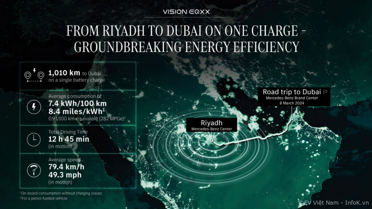 Đây là lần thứ ba EQXX chinh phục cự li ấn tượng trên 1.000km với một lần sạc. Hôm nay, chiếc xe đã hoàn thành chuyến đi từ Riyadh tới Dubai, quãng đường vừa chính xác là 628 dặm, một lần nữa chứng tỏ khả năng tiết kiệm nhiên liệu ở mức 7,4 kWh/100km. Với thông số này, EQXX đã cải thiện đáng kể so với con số gần 8 kWh/100km của lần thử nghiệm trước.