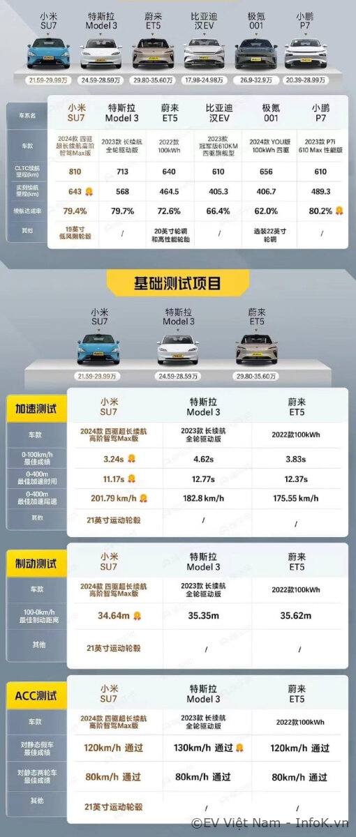 Ở bài đánh giá chạy 400 mét, SU7 giành chiến thắng với 11,17 giây, tiếp theo là Nio ET5 với 12,37 giây và Tesla Model 3 với 12,77 giây. Xiaomi cũng đạt tốc độ 201,79 km/h.