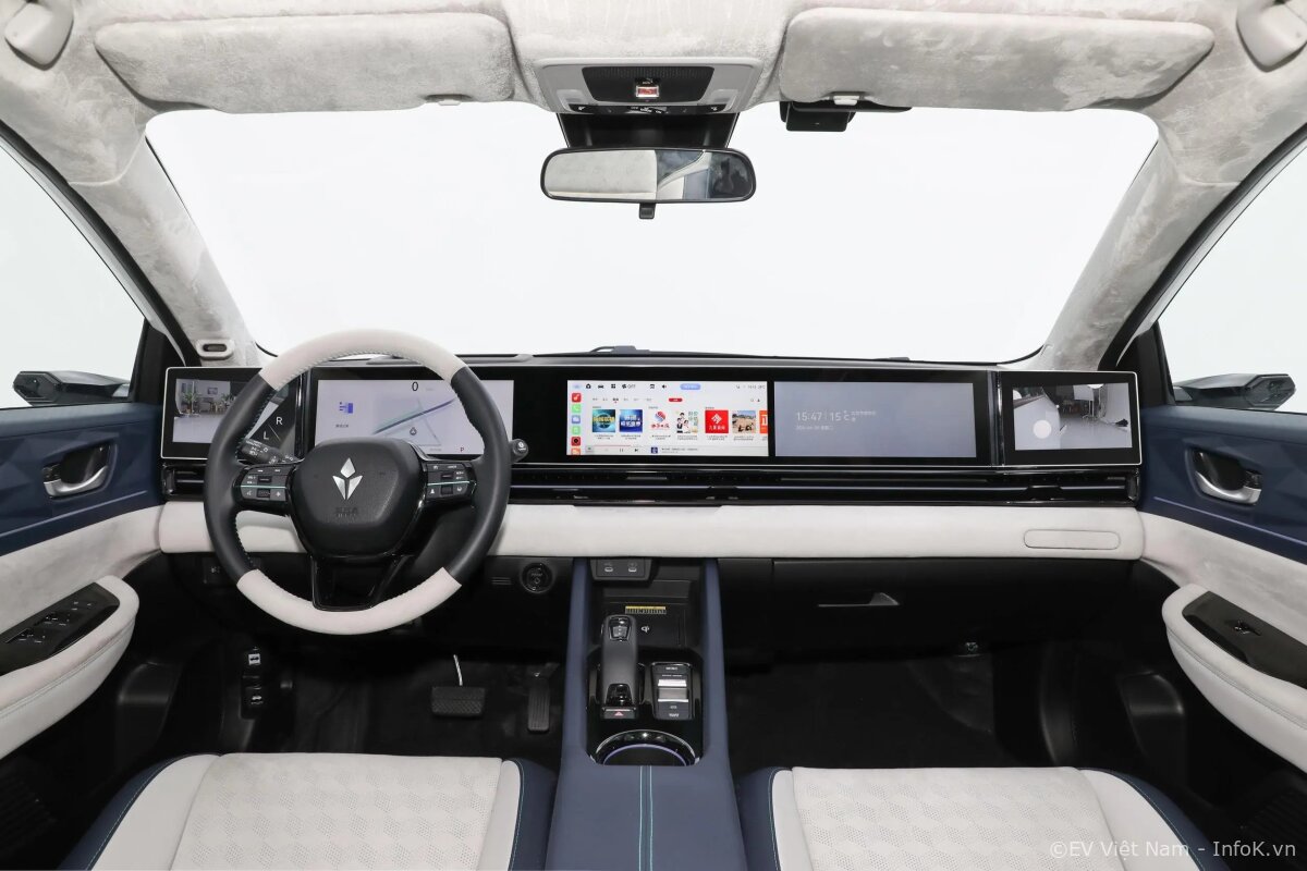 Bên trong, khoang lái có vô lăng tròn truyền thống và 5 màn hình, bao gồm bảng đồng hồ full LCD, màn hình điều khiển trung tâm, màn hình giải trí cho ghế phụ và màn hình dành cho gương chiếu hậu. Bên cạnh đó, màn hình HUD cung cấp thông tin như tốc độ xe, điều hướng và biển báo giao thông trên kính lái giúp lái xe dễ dàng theo dõi, tránh mất tập trung.